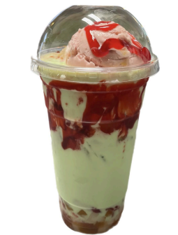 Honeydew milk tea with tropical jellies, strawberry drizzle, a scoop of strawberry ice cream and a top of whip cream!!!