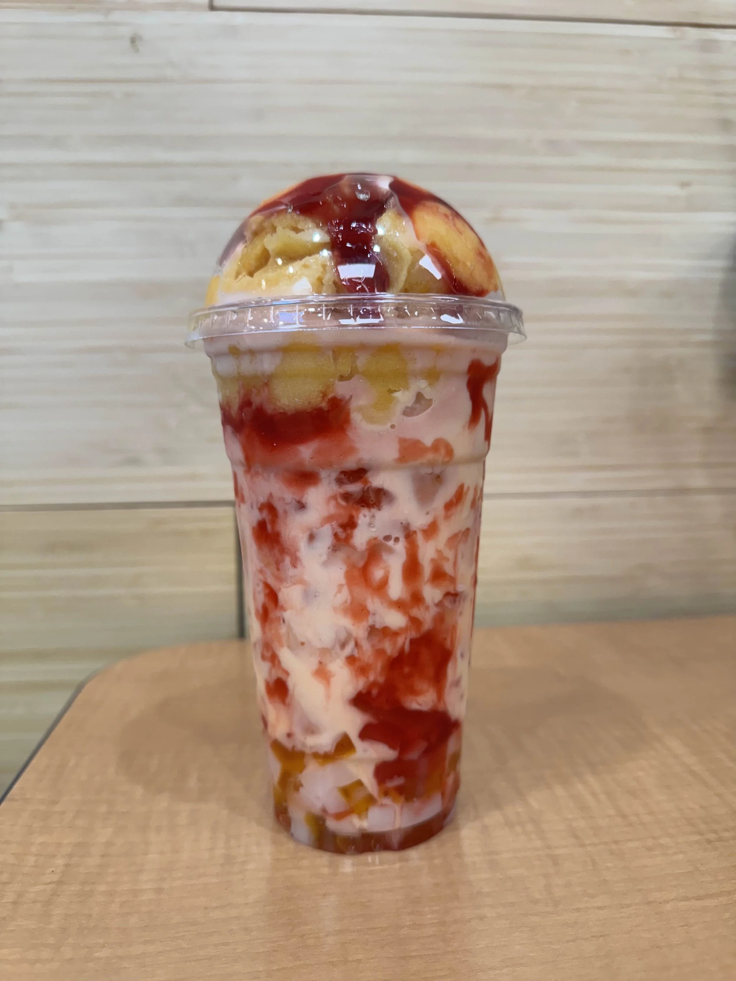 Mango milk tea with tropical jellies, raspberry drizzle, a scoop of mango ice cream and a top of whip cream!!!